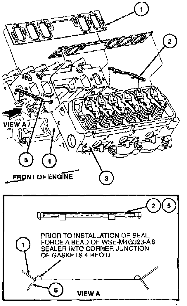 3. Apply a 3-4 mm (0.125 inch) bead of Silicone Gasket and Sealant F6AZ-19562-AA or equivalent meeting Ford specifications WSE-M4G323-AA at each corner where the cylinder head joins the cylinder block.