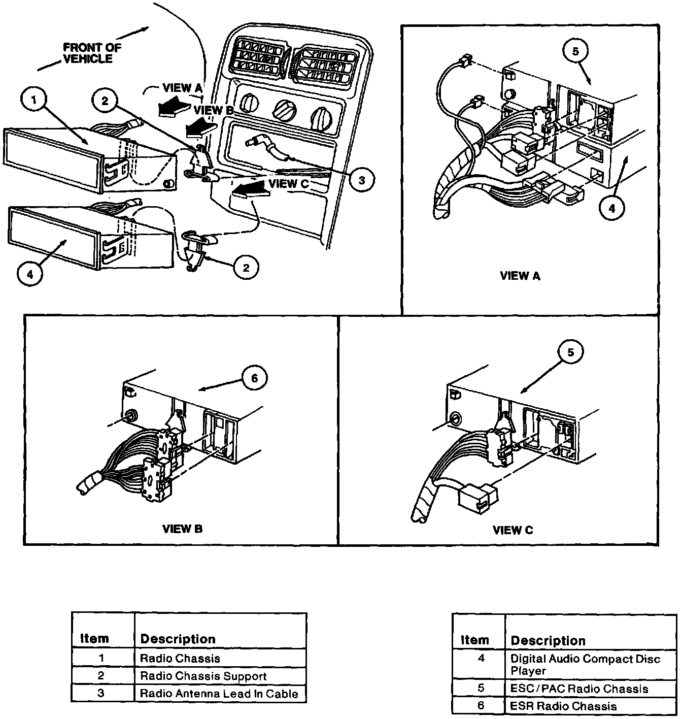 4. Disconnect the connectors and remove the radio chassis or digital audio compact disc player.