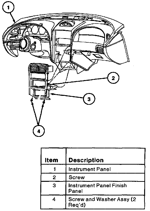 1. Engage four clips and install instrument panel finish panel to instrument panel with three retaining screws.