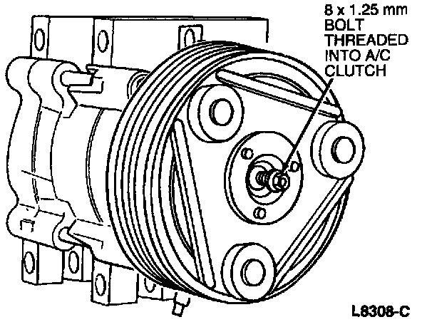 3. If A/C clutch cannot be pulled from A/C compressor shaft, screw an 8 mm x 1.25 mm bolt into the shaft hole of the A/C clutch to force it from the shaft.