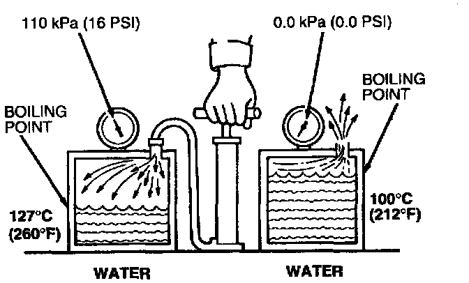 Another effect of pressure is an increase in temperature even though heat has not been added. For example, if refrigerant R-134a vapor is compressed from 206 kPa to 1206 kPa (30 psi to 175 psi), the vapor temperature will increase from 0°C to 54° C (32°F to 130°F) and the boiling/condensation point will also increase.