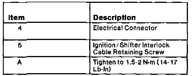 Tighten ignition/shifter interlock cable retaining screws at steering column assembly to 1.5-2 Nm (14-17 inch lbs.) and at gearshift lever cam to (15-19 inch lbs.).