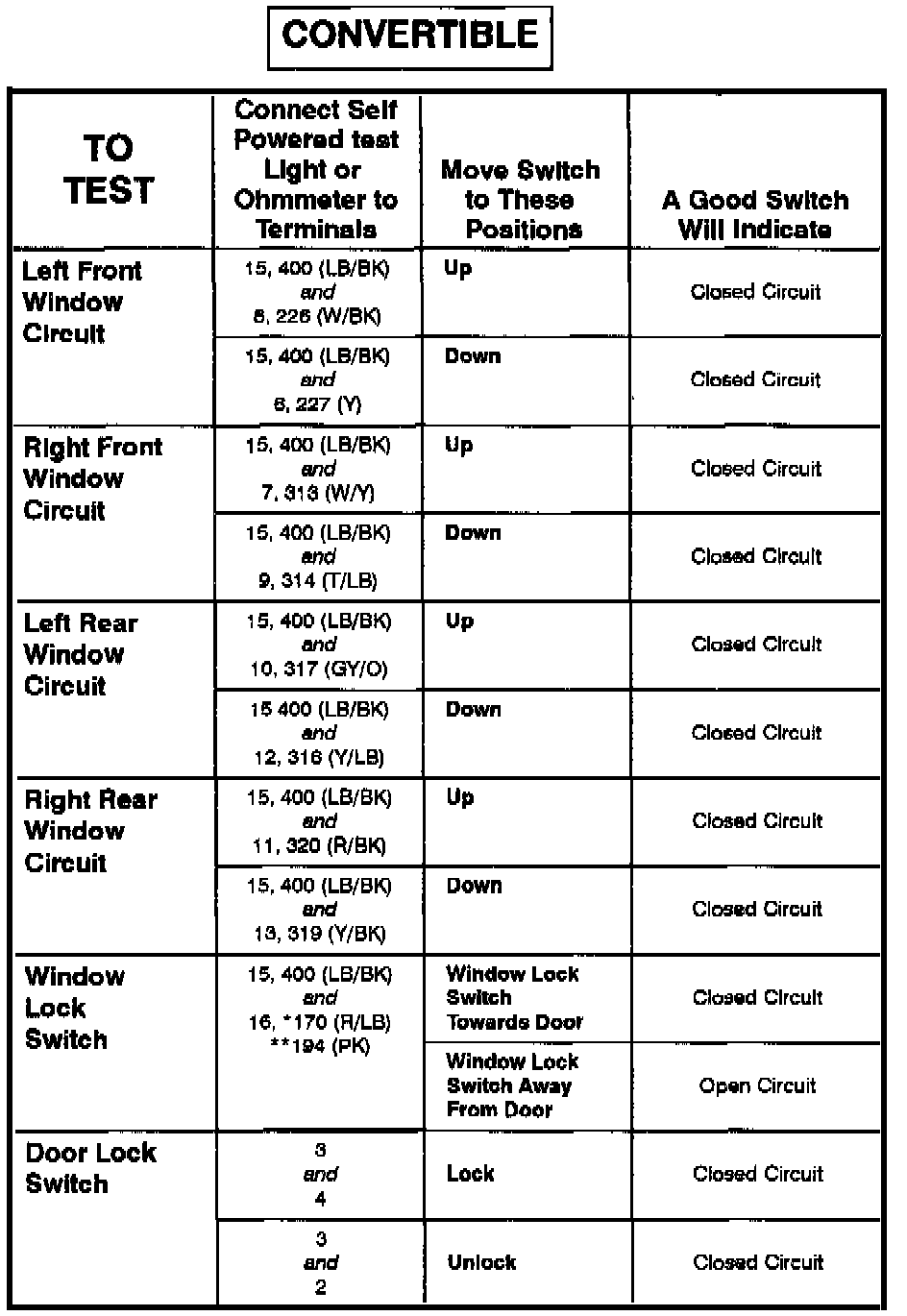 Master Window/Door Lock Control Switch - Terminal Locations (Convertible):