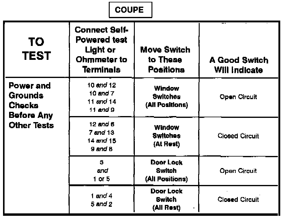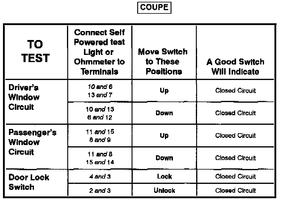 Master Window/Door Lock Control Switch - Component Testing Procedure (Part 1 Of 2) (Coupe):