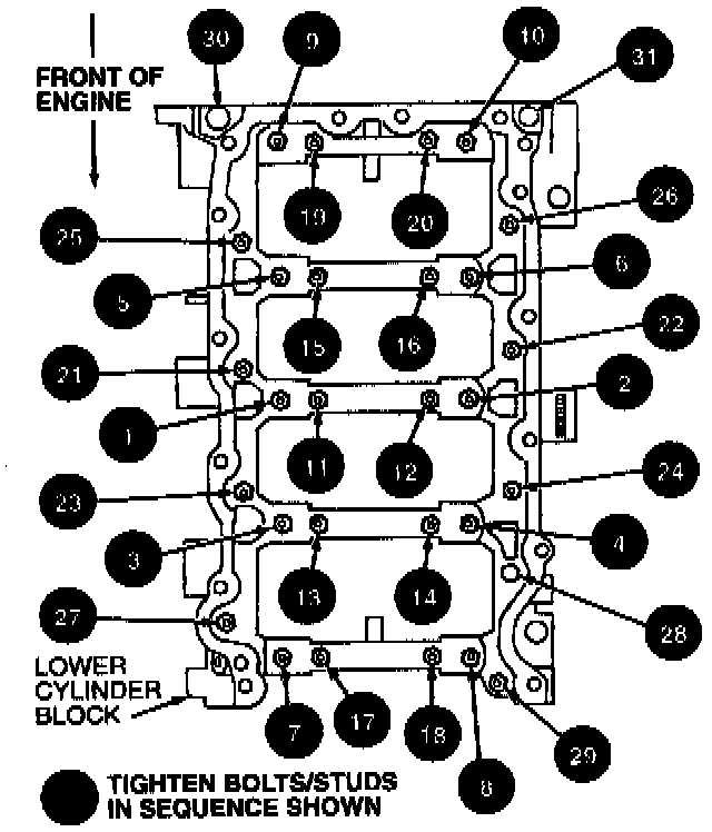 - Tighten lower cylinder block-to-upper cylinder block retaining bolts in sequence, as follows: