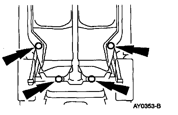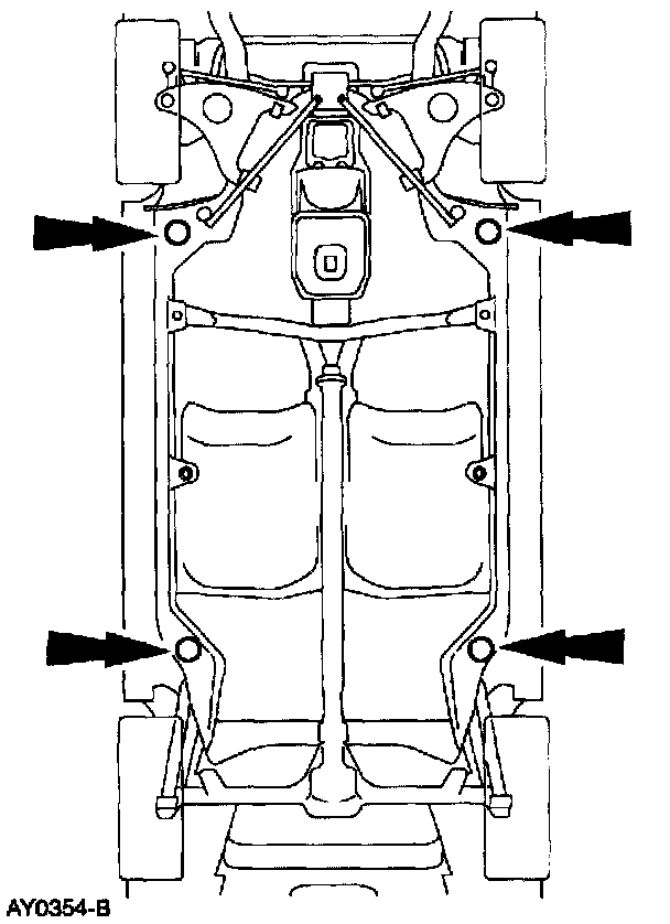 ^ Do not allow the hoist adapters to contact the steering linkage, suspension arms, stabilizer bar, rear subframe stabilizer brackets or to compress the lower suspension arm stabilizer bar insulator. Damage to the suspension, exhaust and steering linkage components may occur if care is not exercised when positioning the hoist adapters of two-post hoists prior to lifting the vehicle.