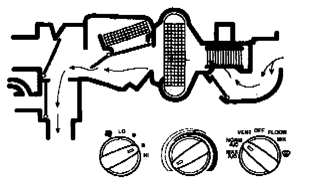 - both the heater air damper door and the windshield defroster door are in the no vacuum position so that most of the incoming air is directed to the windshield defroster hose nozzles. There is also airflow to the A/C side window demister and hoses.