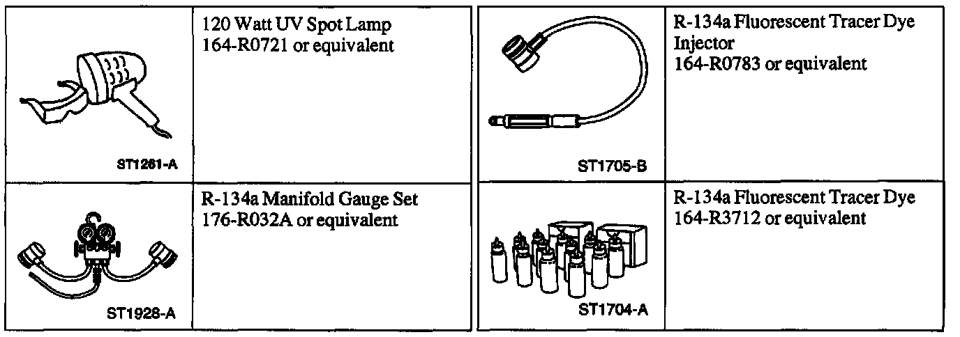 NOTE: Ford Motor Company vehicles are produced with R-134a Leak Tracer Dye incorporated into the A/C system. The location of leaks can be pinpointed by the bright yellow-green glow of the tracer dye. Since more than one leak can exist, always inspect each component.