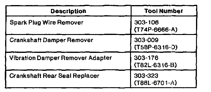 9. Remove crankshaft pulley and the crankshaft damper. Use Crankshaft Damper Remover 303-009 (T58P-6316-D) and Vibration Damper Remover Adapter 303-176 (T82L-6316-B) to remove vibration damper.