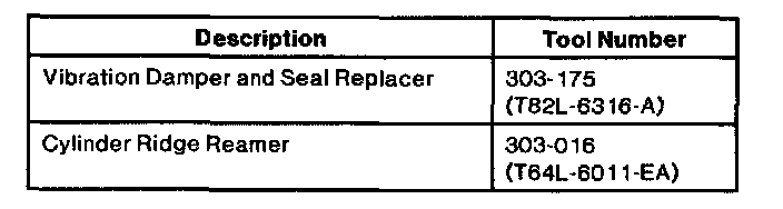 Before removing the pistons, inspect the top of the cylinder bores. If necessary, remove the ridge and/or carbon deposits from each cylinder using a Cylinder Ridge Reamer 303-016 (T64L-6011-EA). Before the ridge or deposits are removed, turn the crankshaft until the piston is at the bottom of its stroke. Cover the piston with a clean shop towel to collect the cuttings. After the cutting operation, turn the crankshaft until the piston is at the top of its stroke and remove the shop towel with the cuttings.