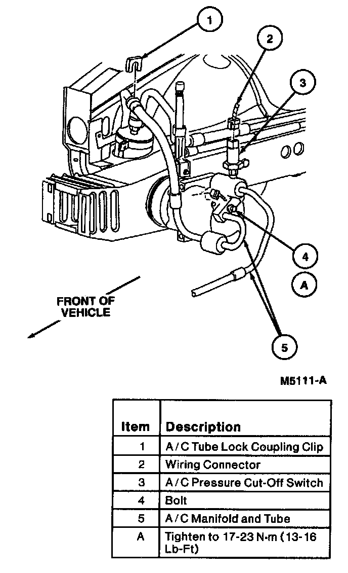 8. Position A/C manifold and tube with O-ring seals to A/C compressor. Install retaining bolt and tighten to 17-23 N.m (13-16 Lb-Ft).