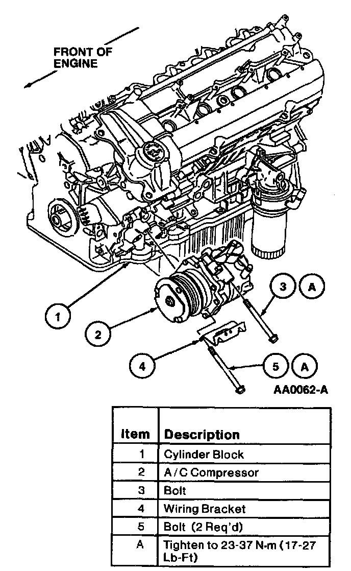 6. Position A/C manifold and tube with O-ring seals onto A/C compressor. Install retaining bolt and tighten to 17-23 N.m (13-16 Lb-Ft).