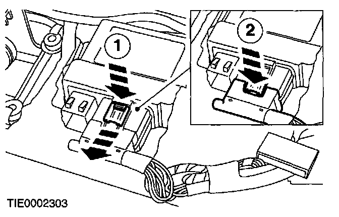 ^ WAIT AT LEAST ONE MINUTE AFTER DISCONNECTING THE BATTERY GROUND CABLE BEFORE DISCONNECTING ANY SUPPLEMENTAL RESTRAINT SYSTEM ELECTRICAL CONNECTORS. FAILURE TO FOLLOW THIS WARNING COULD CAUSE PREMATURE DEPLOYMENT AND MAY CAUSE PERSONAL INJURY.