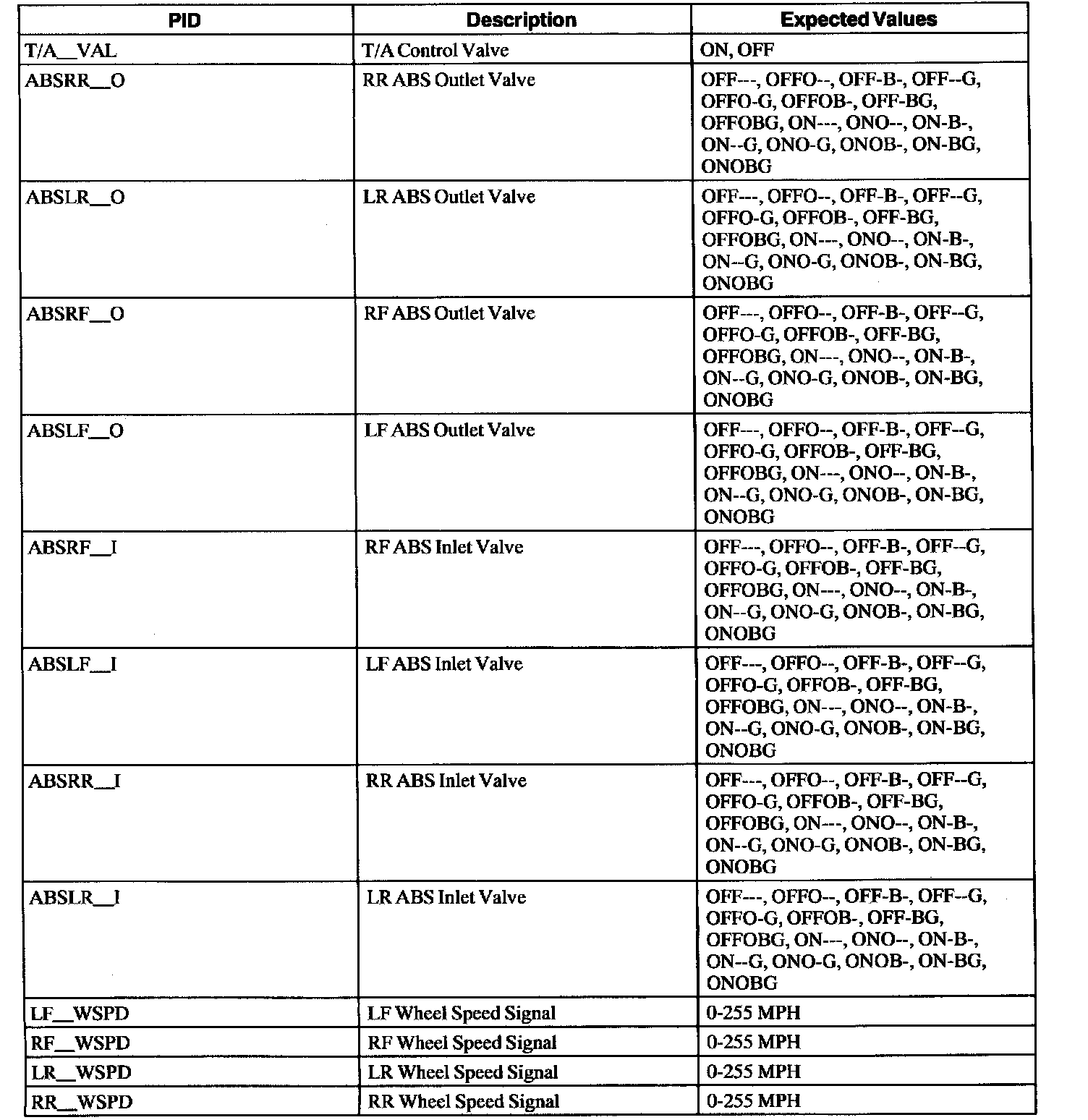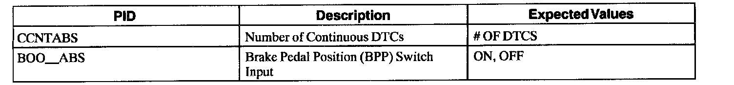 ABS Control Module Parameter Identification (PID) Index