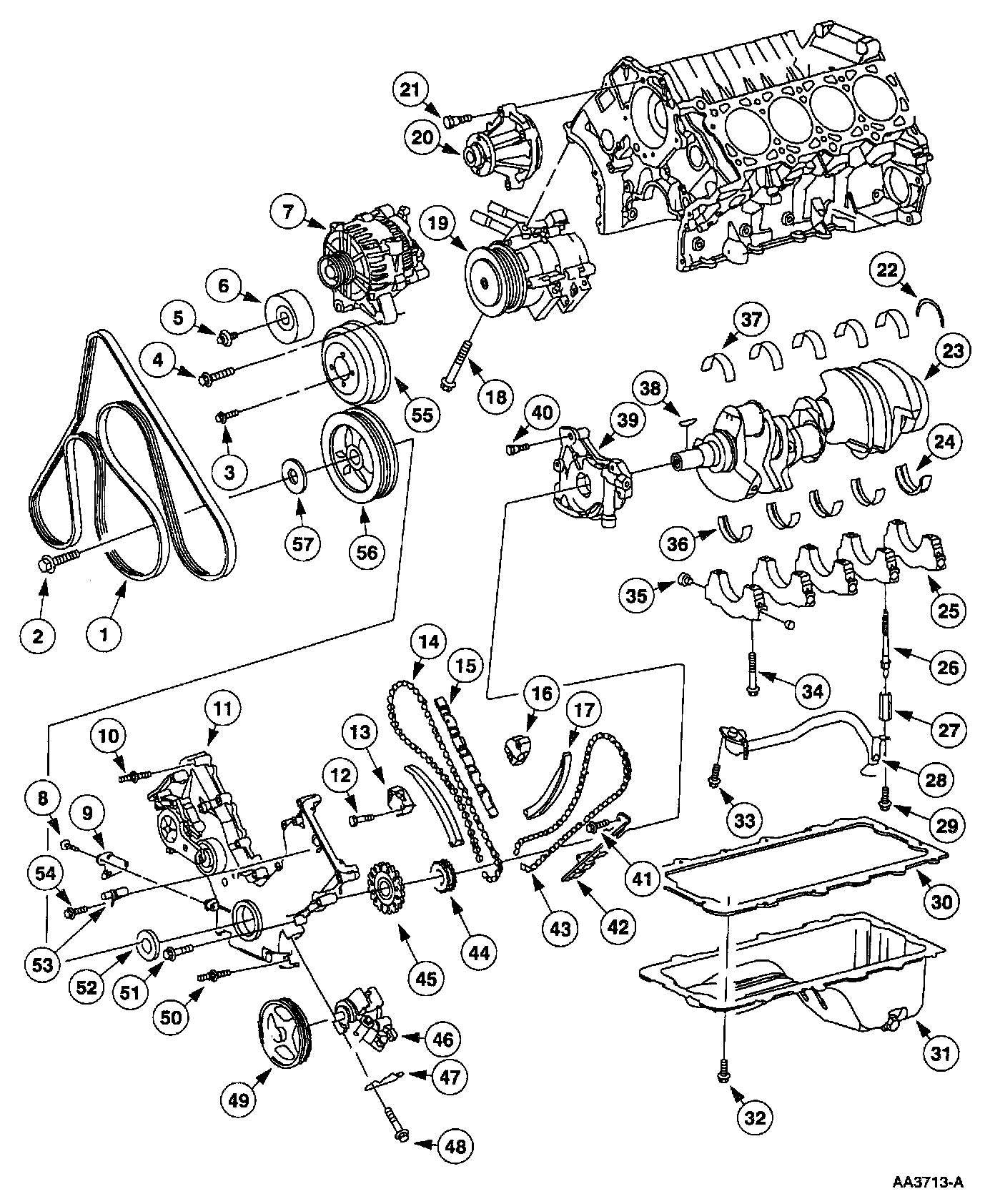 The concept of modularity allows engine designs to share communization between concepts and engine hardware. The illustration (modular engine-typical) represents the basic cross sectional view of a modular V8 engine. The four modules are the: