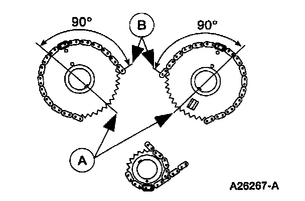 Make sure that the (A) camshaft sprocket keyway is 90 degrees from the (B) valve cover mounting surface.