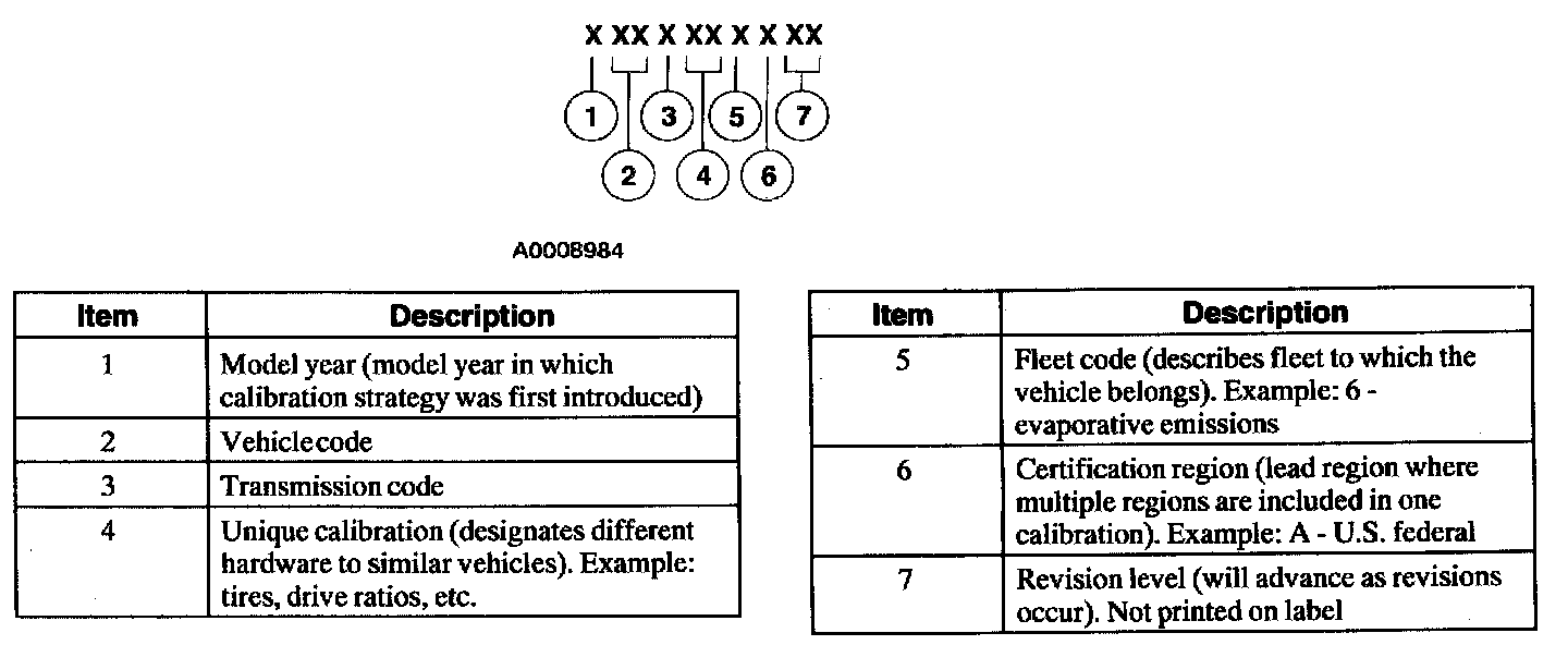 Powertrain calibration information is printed in the lower right corner of the Vehicle Certification Label. Only the base calibration information is printed. Revision levels will not appear, however, they can be found in On Line Automotive Service Information System (OASIS). For the current model year, Ford Motor Company is using three different protocols which describe powertrain base calibration. These protocols are designed to provide worldwide standardization for vehicle calibration. If the electronic calibration strategy has been used since 1998 and carried into the current model year, protocol 1 will be used. Refer to Protocol 1. If the electronic calibration strategy has been used since 1999 and is carried into the current model year, protocol 2 will be used. Refer to Protocol 2. For new electronic calibration strategies for the current model year, use protocol 3. Refer to Protocol 3.