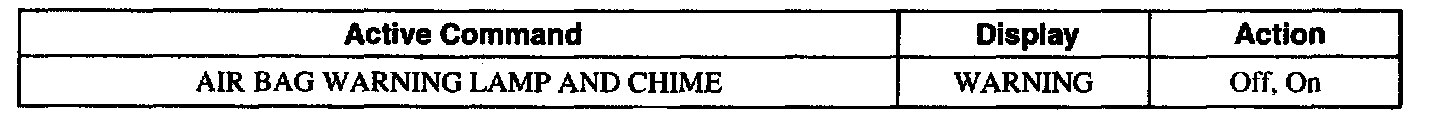 This command allows the technician to verify operation call of the air bag indicator and chime. When the air bag output command is executed, the indicator and the me are activated simultaneously for approximately four seconds. Both devices are deactivated automatically.