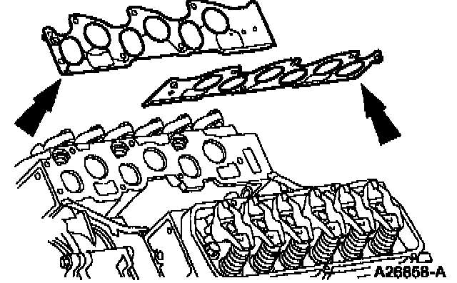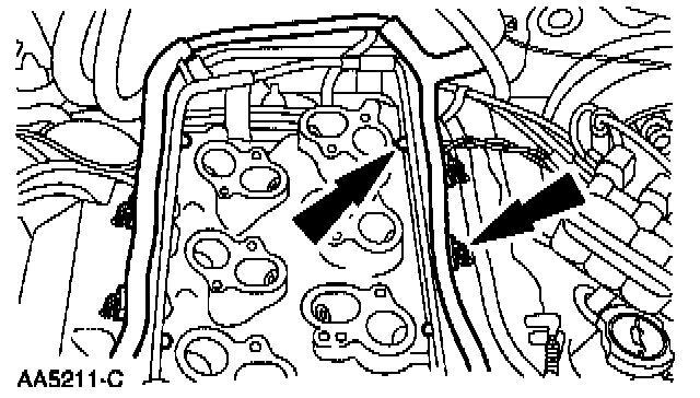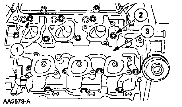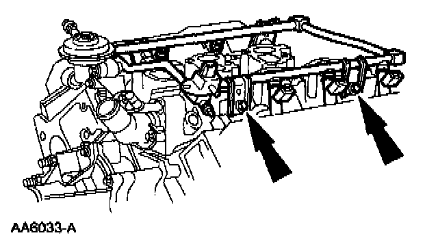 1 Apply a bead of sealant to the lower intake manifold mounting at the points indicated. Use Silicone Gasket and Sealant F7AZ-19554-EA or equivalent meeting Ford specification WSE-M4G323-A4.