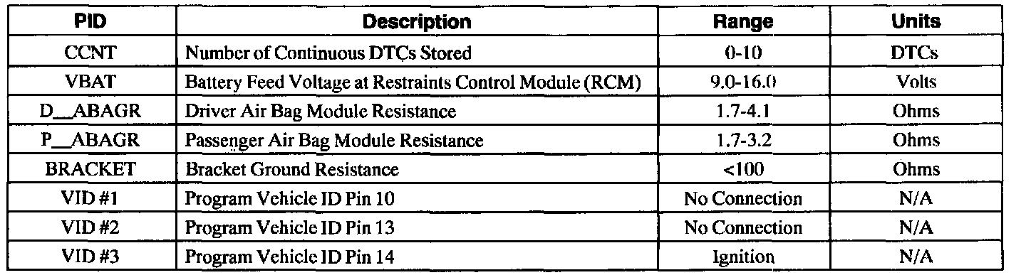 The PID/Data Monitor and Record option allows the scan tool operator to read the state of several Parameter IDs (PIDs) to aid in diagnosing the system. PIDs are real time measurements of parameters such as voltages, resistances, etc., calculated by the (RCM) and sent to the scan tool for display. Many of the PIDs supported by the RCM are calculated periodically and are, therefore, not true real time readings. The Restraints Control Module (RCM) Parameter Identification (PID) Table, is a table of supported PIDs, expected range and units of measurement.