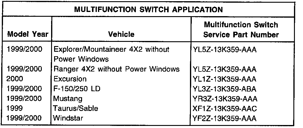 Refer to the Multifunction Switch Application Chart for the applicable switch.