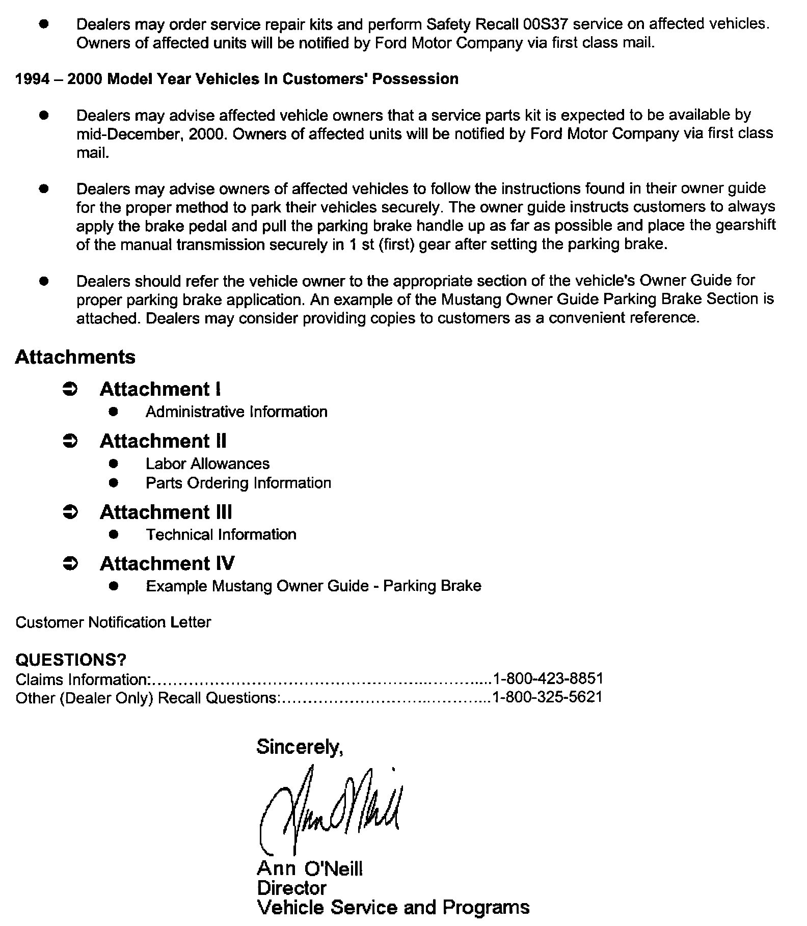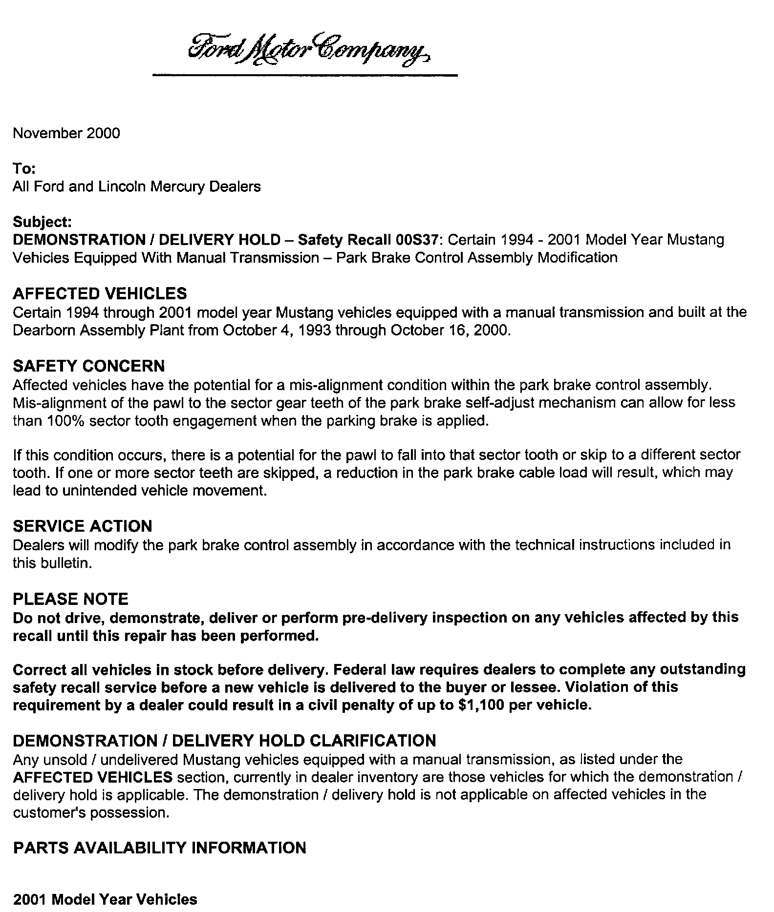 Dealer Letter - November 2000