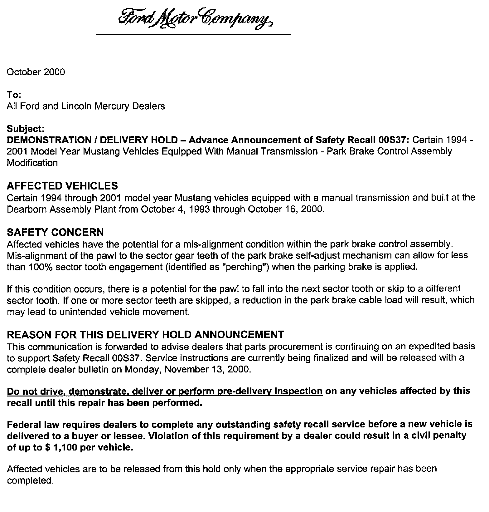 Dealer Letter - October 2000