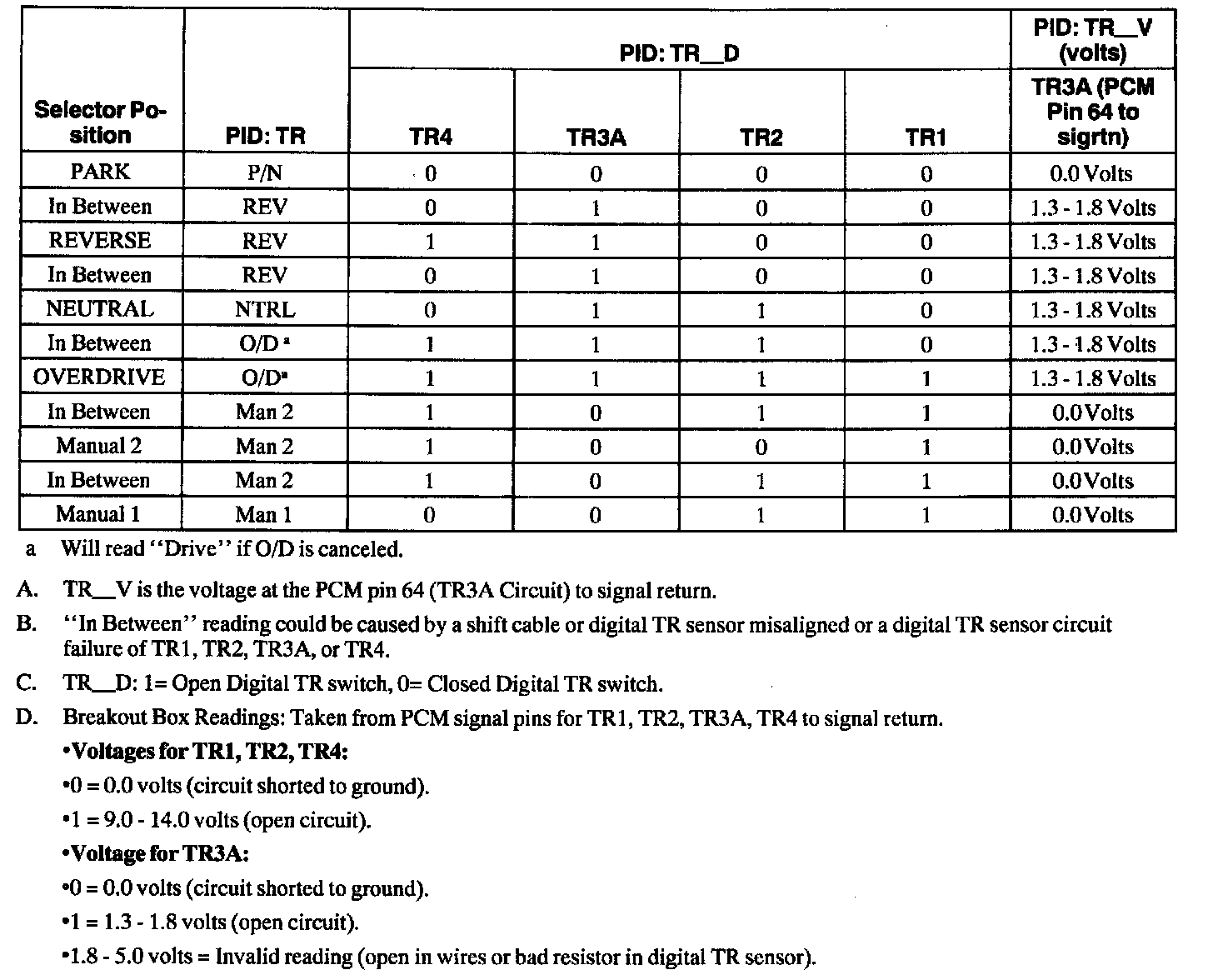 ^ TR4, TR3A, TR2, and TR1 are all closed in park (shorted to signal return), so Park is a good position to check for intermittent open circuits (with scan tool monitoring TR_D).