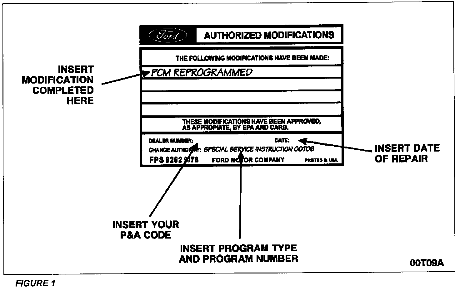 2. Obtain and prepare the Authorized Modifications Label. Write the modification completed, your P&A Code, date of repair and the program type and program number as shown.