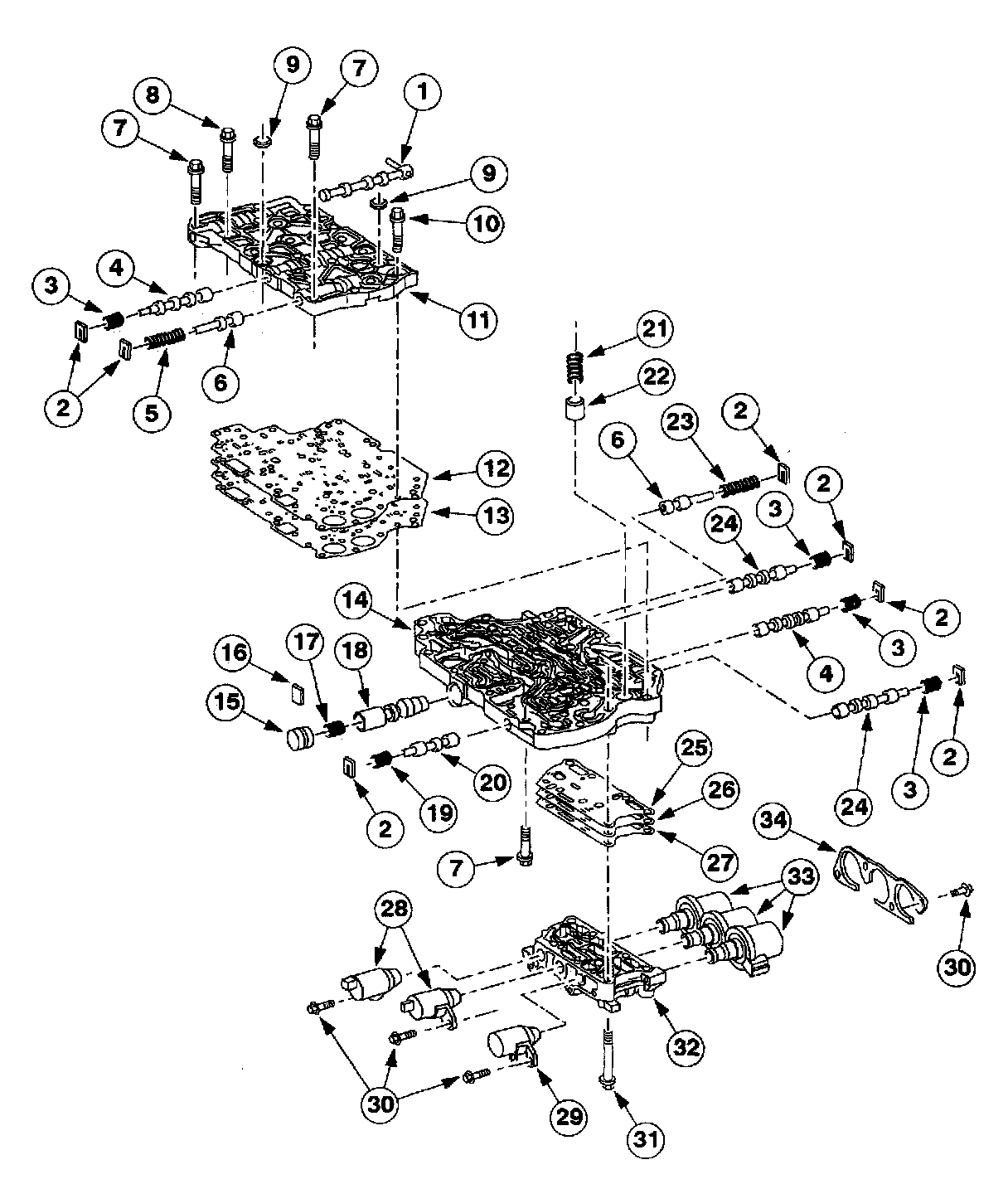 1. Remove the solenoid body bolts and the solenoid body.