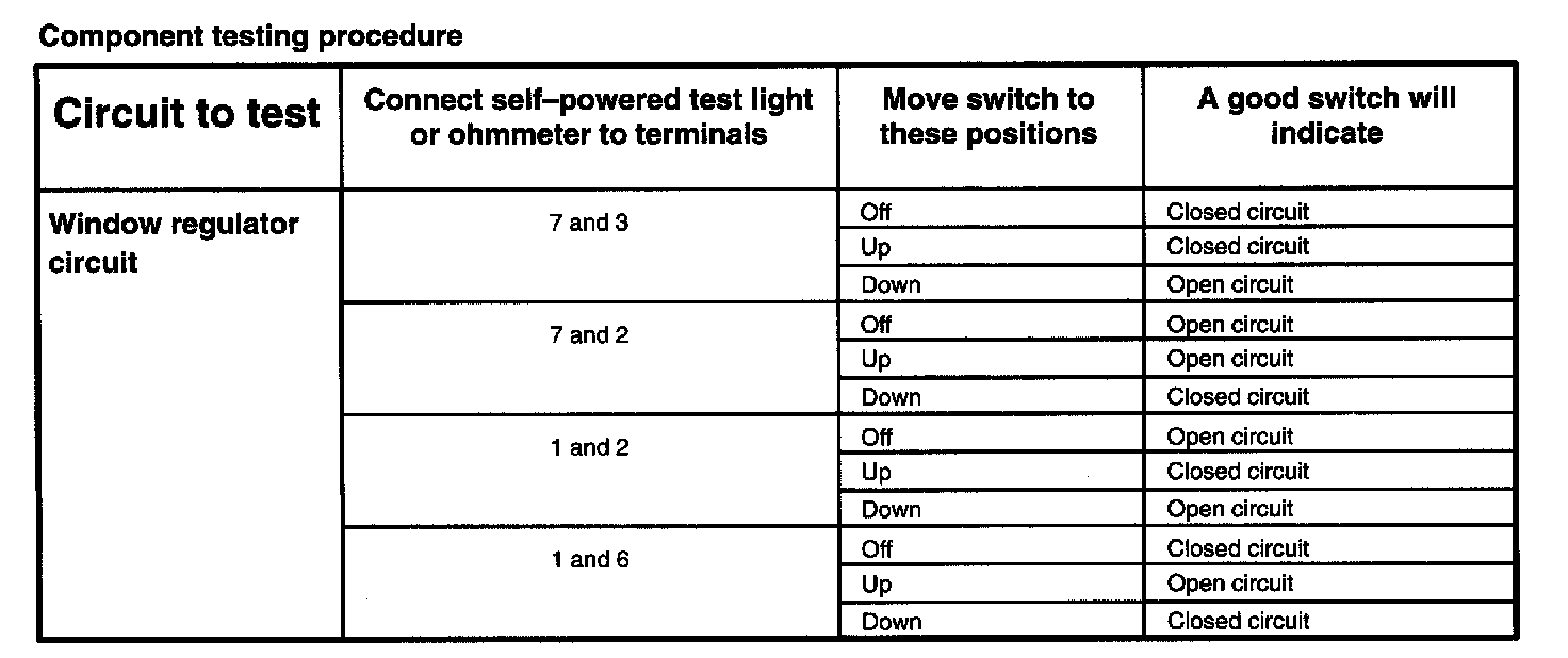 The component connector MUST BE REMOVED before testing. To test a single circuit within the component, select that circuit under the column TO TEST. If you wish to test the complete component, perform all tests.