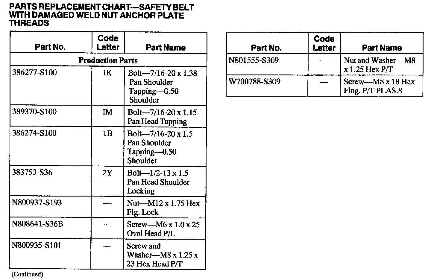 PARTS REPLACEMENT CHART - SAFETY BELT WITH DAMAGED WELD NUT ANCHOR PLATE THREADS: