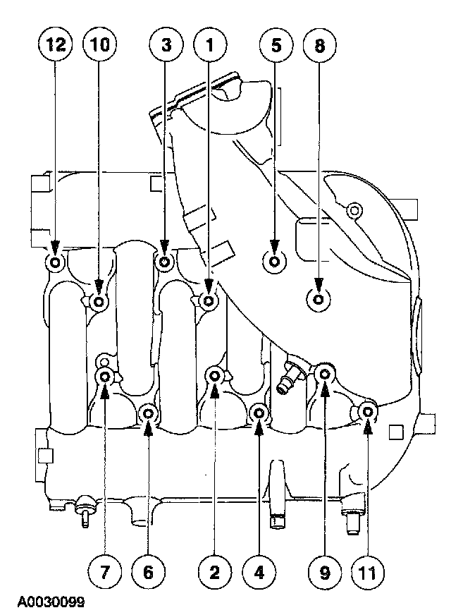 Install the upper intake manifold. Tighten the bolts in the sequence shown in two stages: