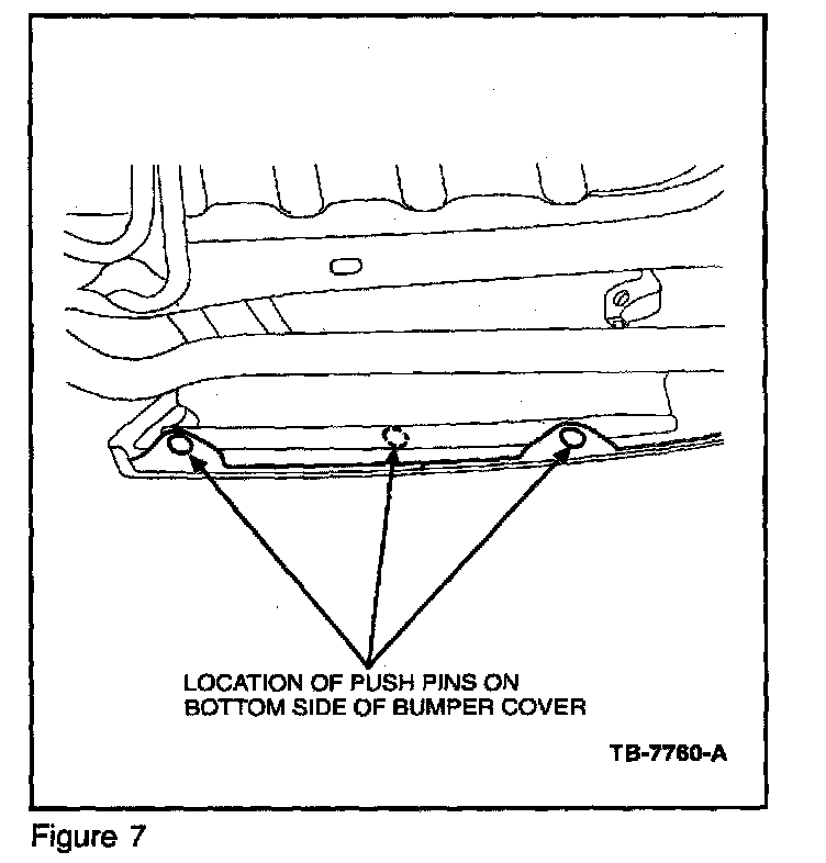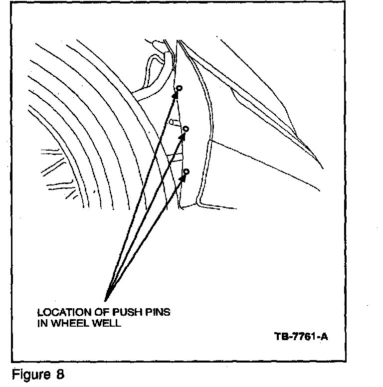 15. Replace the six (6) pin-type retainers (three (3) on each side) in the wheel well leading edge of the bumper (Figure 8) and the push pin-type retainers (two (2) or three (3) on each side) from bottom sides of bumper cover (Figure 7).