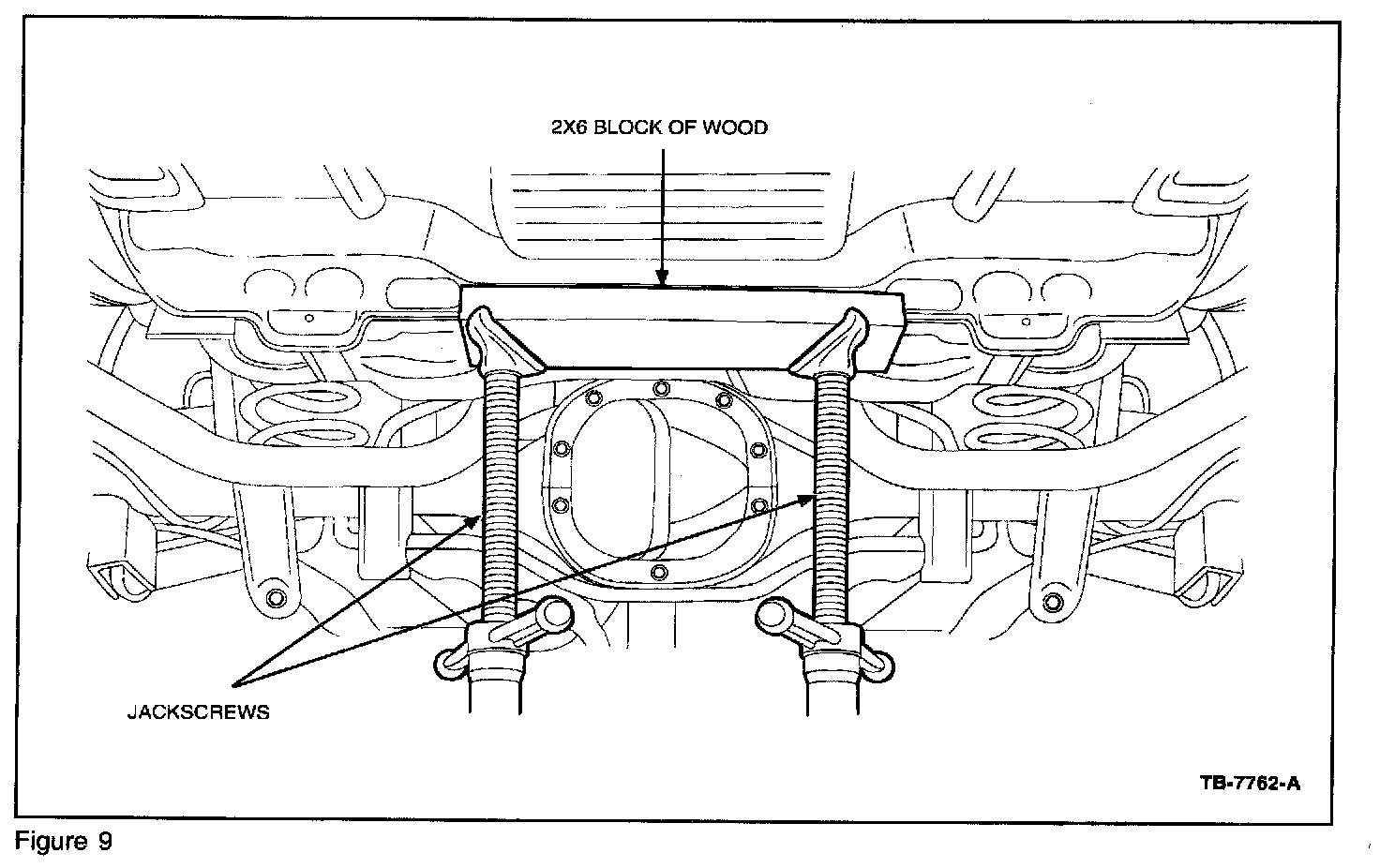 9. Install a 2X6 block of wood and two (2) jackscrews up tight against the body between the body drain plugs, partially under the trunk and the fuel tank (Figure 9).