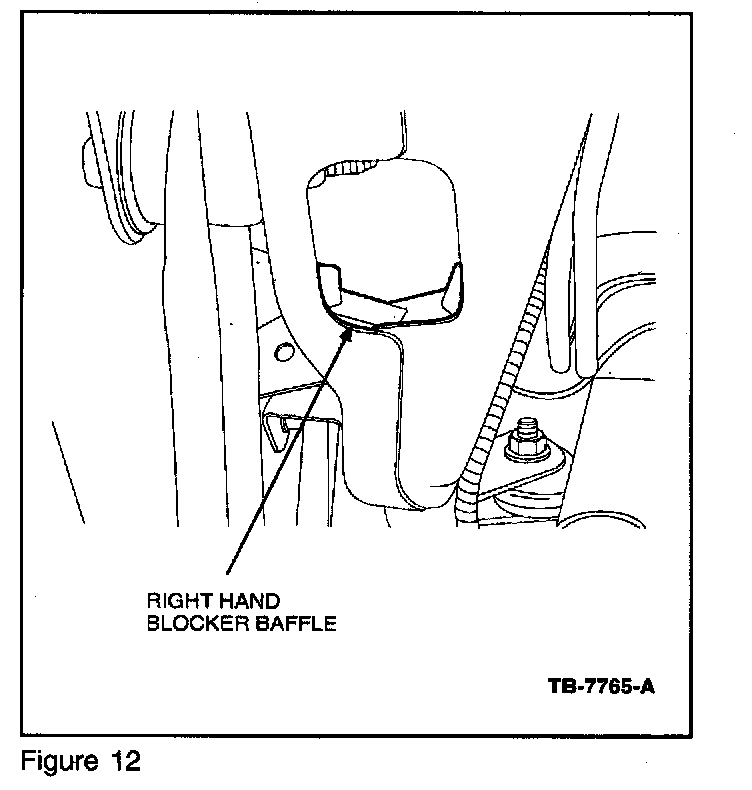 b. On the right hand side bracket, line up the vertical face of the blocker baffle to the rear edge of the access hole. The top end of the baffle must be 6 to 12 mm (1/4" to 1/2") forward of the top rear weld on the lower trailing arm bracket (Figure 12). Inspect the blocker baffle for a good seal between the frame and the blocker baffle. If needed, using a flat screwdriver push all the flanges of the blocker baffle to improve seal between the blocker baffle and the frame. Tack weld the blocker baffle.