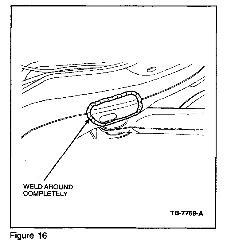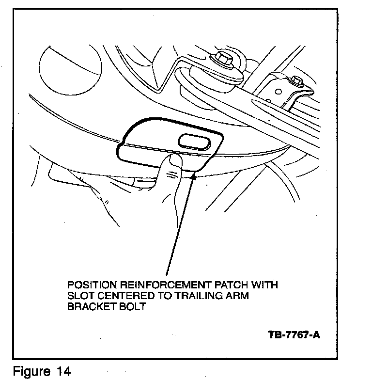 8. Center the slot of Reinforcement Patch (4W73-5A123-AA right hand side marked "R") or 4W73-5A124-M left hand side (marked "L") to the center of the trailing arm bolt taking care that the frame rail does not overlap the slot (Figure 14). Tack in place, then weld around the reinforcement plate completely (Figure 15 and 16).