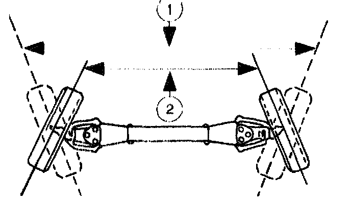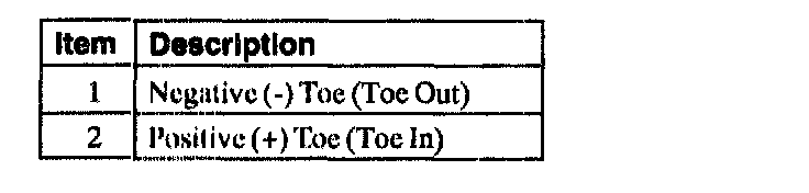 When the wheels are turned in toward the front of the vehicle, toe is positive (+) (toe inch). When the wheels are turned out toward the front of the vehicle, toe is negative (-) (toe out). Toe is measured in degrees, from side to side, and totaled.