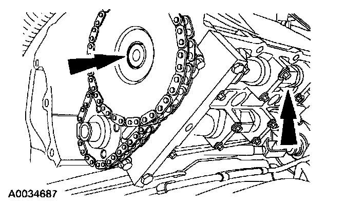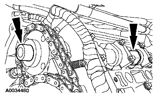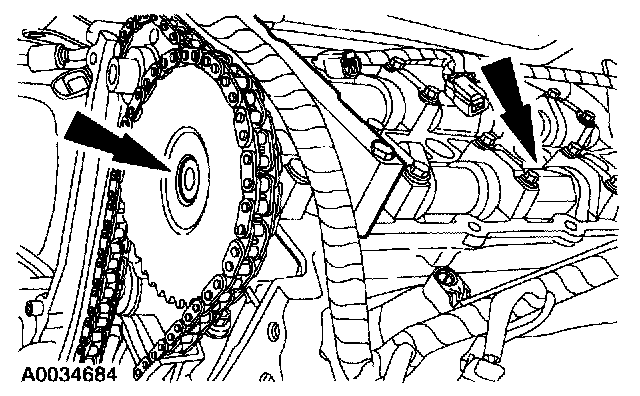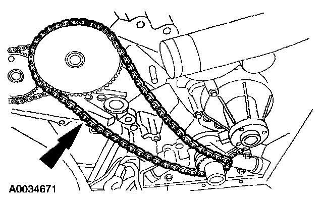 ^ Position the timing chain over the LH intake camshaft sprocket. Position the crankshaft gear in the timing chain. Position the timing chain and crankshaft gear over the crankshaft as an assembly.