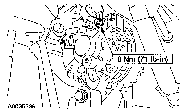 8. Remove the nut and position the generator B+ wire harness end aside.