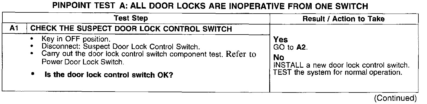 PINPOINT TEST A: ALL DOOR LOCKS ARE INOPERATIVE FROM ONE SWITCH