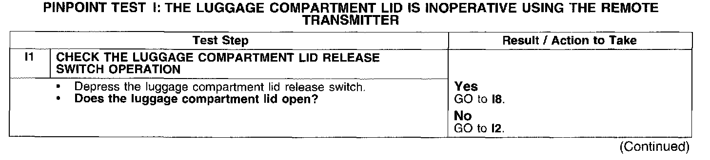 PINPOINT TEST I: THE LUGGAGE COMPARTMENT LID IS INOPERATIVE USING THE REMOTE TRANSMITTER