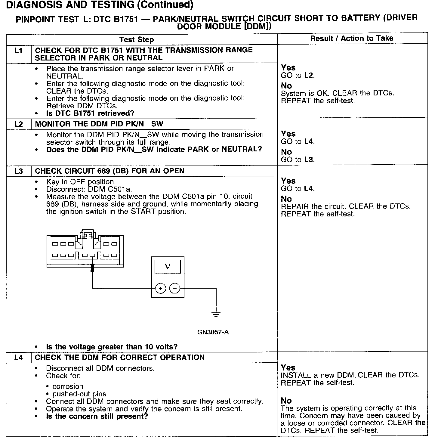 PINPOINT TEST L: DTC B1751 - PARK/NEUTRAL SWITCH CIRCUIT SHORT TO BATTERY (DRIVER DOOR MODULE)