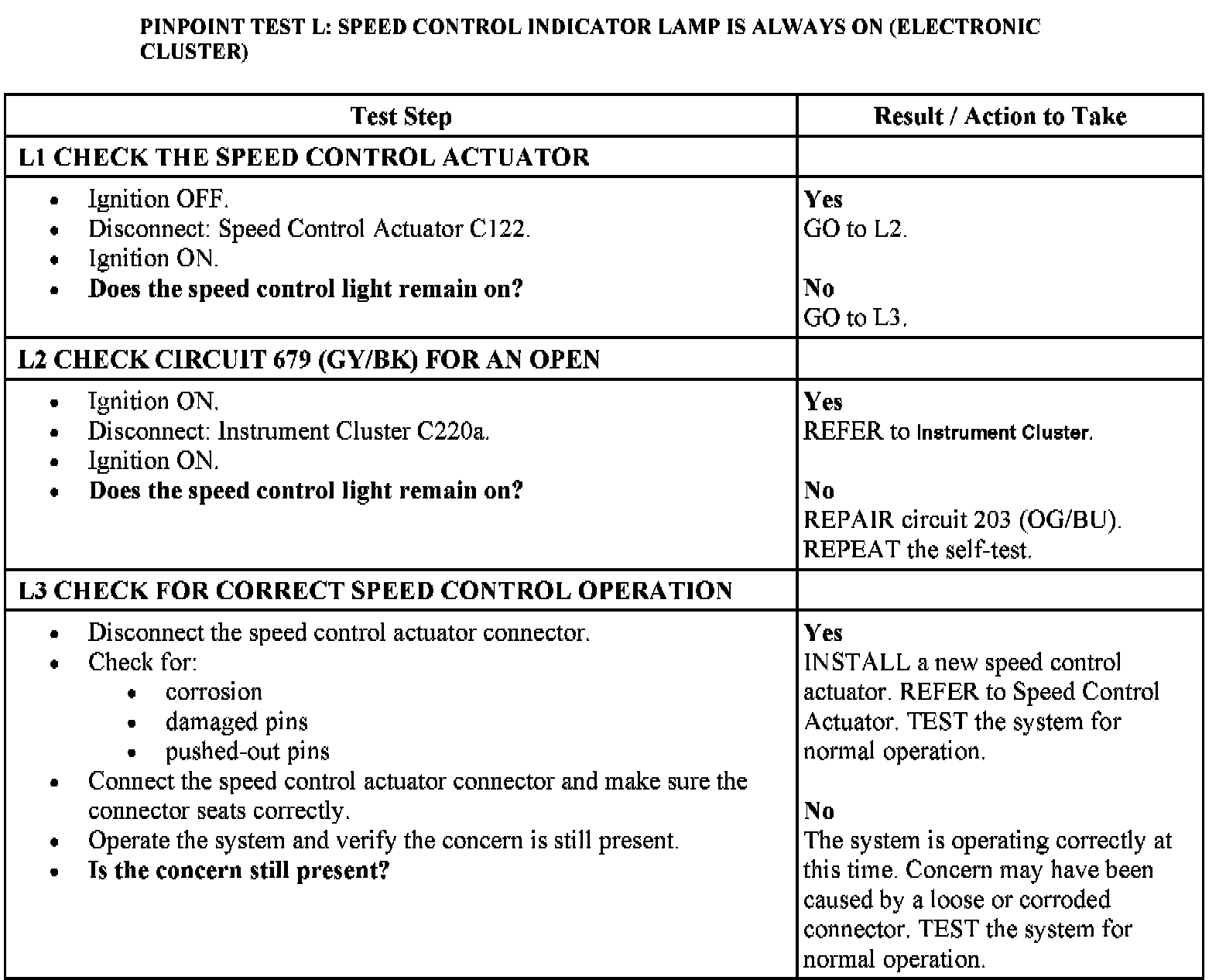 PINPOINT TEST L: SPEED CONTROL INDICATOR LAMP IS ALWAYS ON (ELECTRONIC CLUSTER)