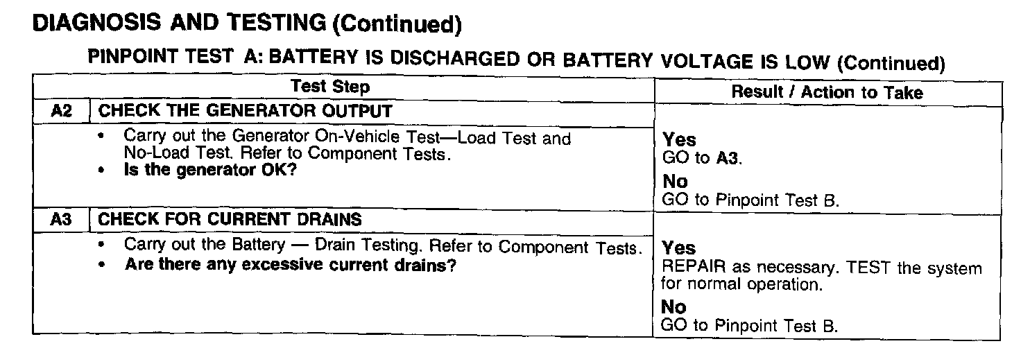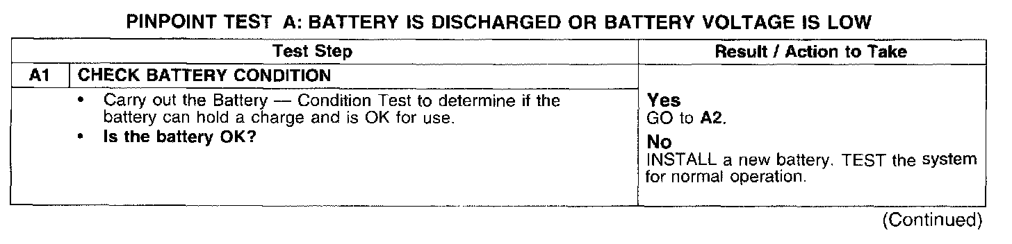 PINPOINT TEST A: BATTERY IS DISCHARGED OR BATTERY VOLTAGE IS LOW