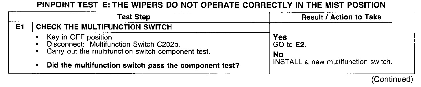 PINPOINT TEST E: THE WIPERS DO NOT OPERATE CORRECTLY IN THE MIST POSITION