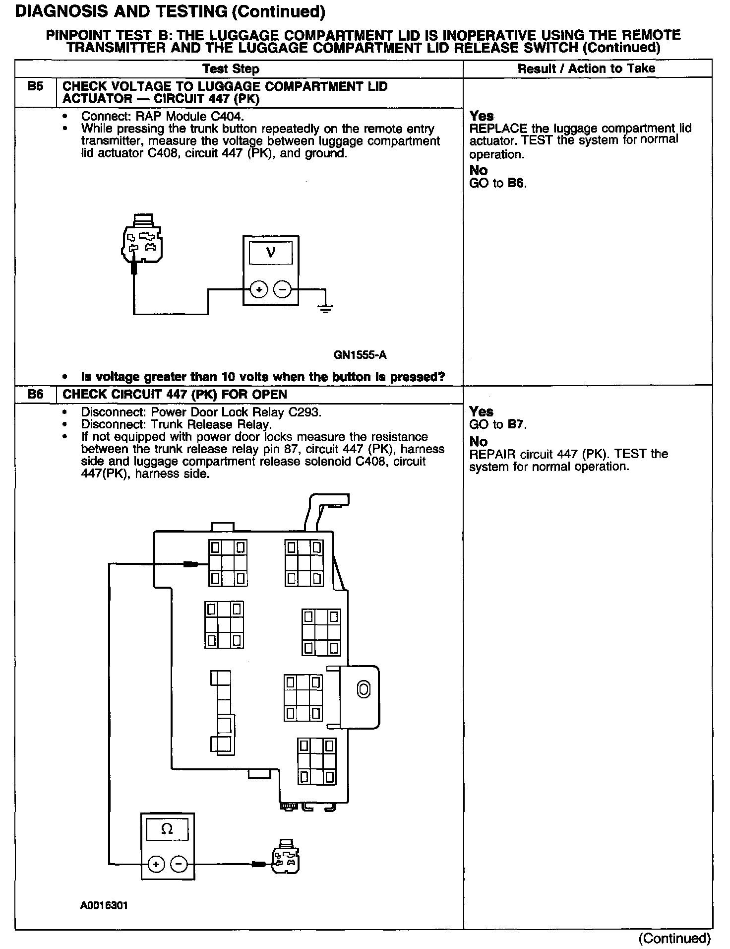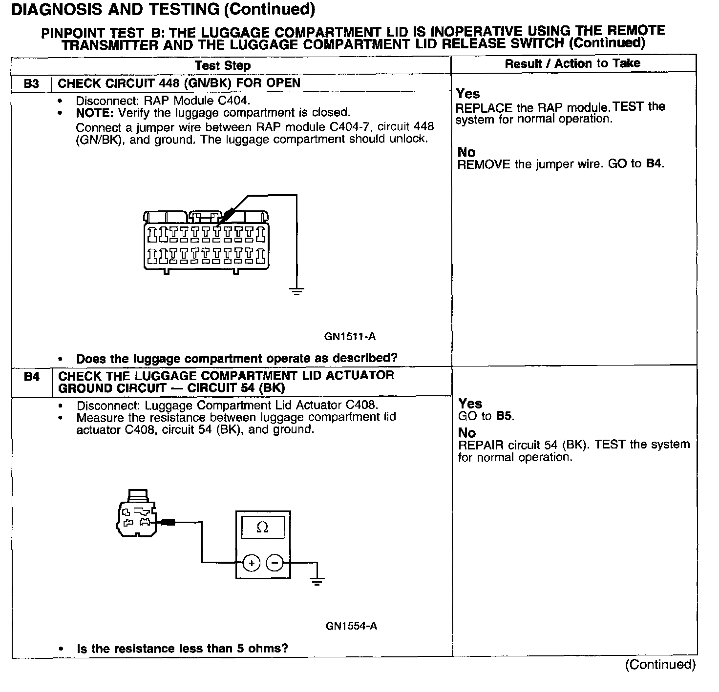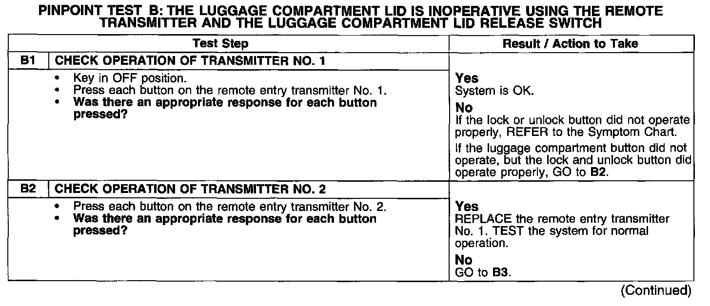 PINPOINT TEST B: THE LUGGAGE COMPARTMENT LID IS INOPERATIVE USING THE REMOTE TRANSMITTER AND THE LUGGAGE COMPARTMENT LID RELEASE SWITCH