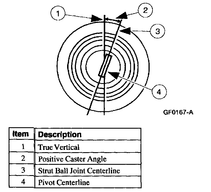 A backward tilt is positive (+) and a forward tilt is negative (-). Front caster adjustment is not a separate procedure on this vehicle. Front caster should fall within specification when the front camber is adjusted.