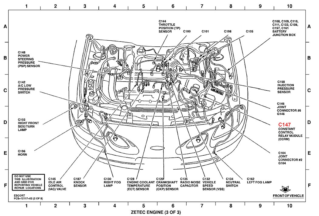 Constant Control Relay Module (CCRM) is located left front of engine.