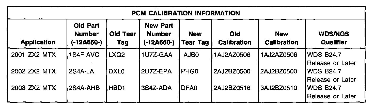 3. Reprogram the PCM with WDS at the Software Version listed in the PCM Calibration chart, and Verify that the PCM Part Number updates to the calibration listed in the chart.